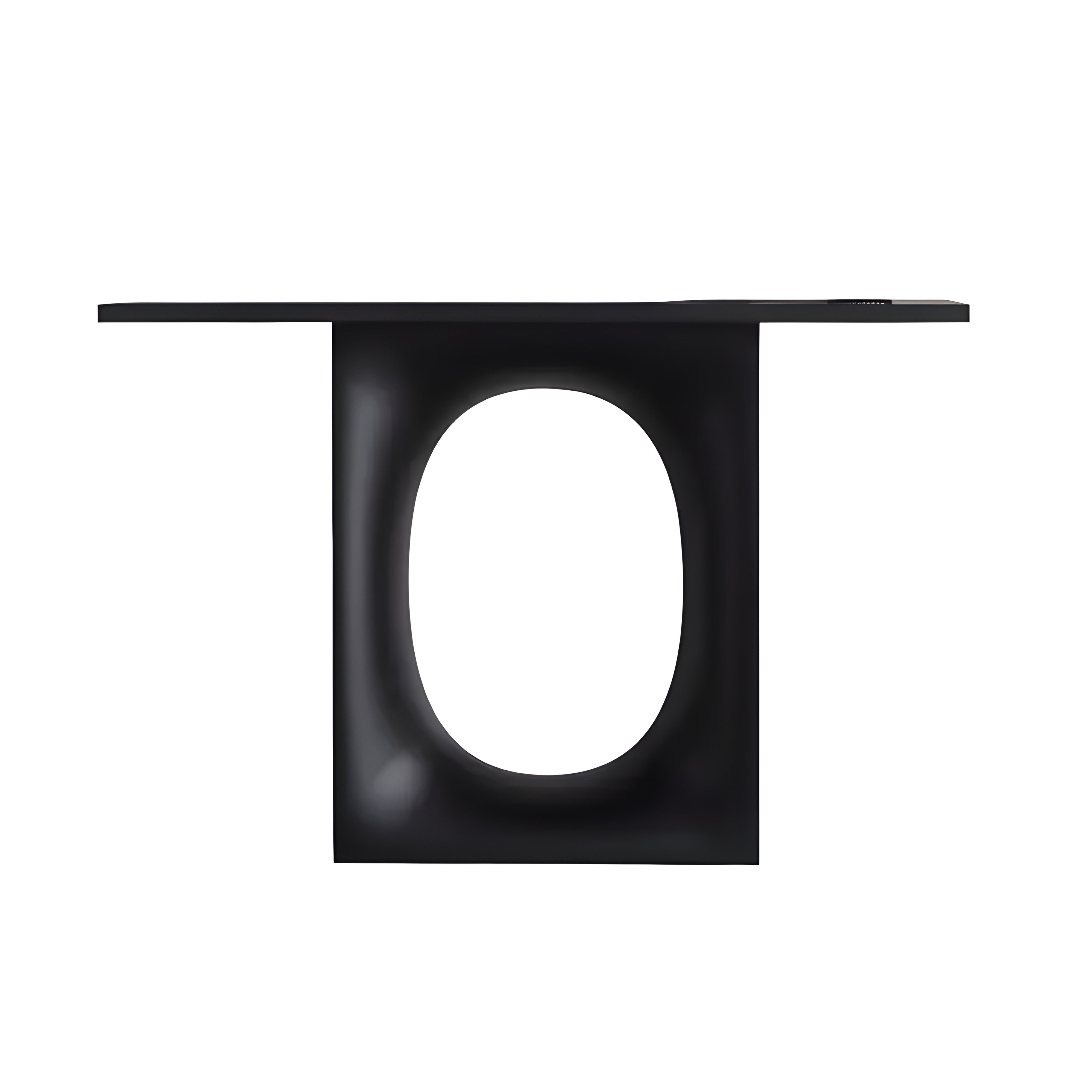 Add a touch of contemporary elegance to your space with the Arlet Console. Crafted from solid wood and finished in a sleek black lacquer, this console table is designed to blend effortlessly with any decor. Its sharp-edged rectangular top sits atop a distinctive base, featuring a striking O-shaped design in the center, enhancing its minimalist silhouette with a hint of sophistication. The Arlet Console is a statement piece that brings both style and function to your home.
