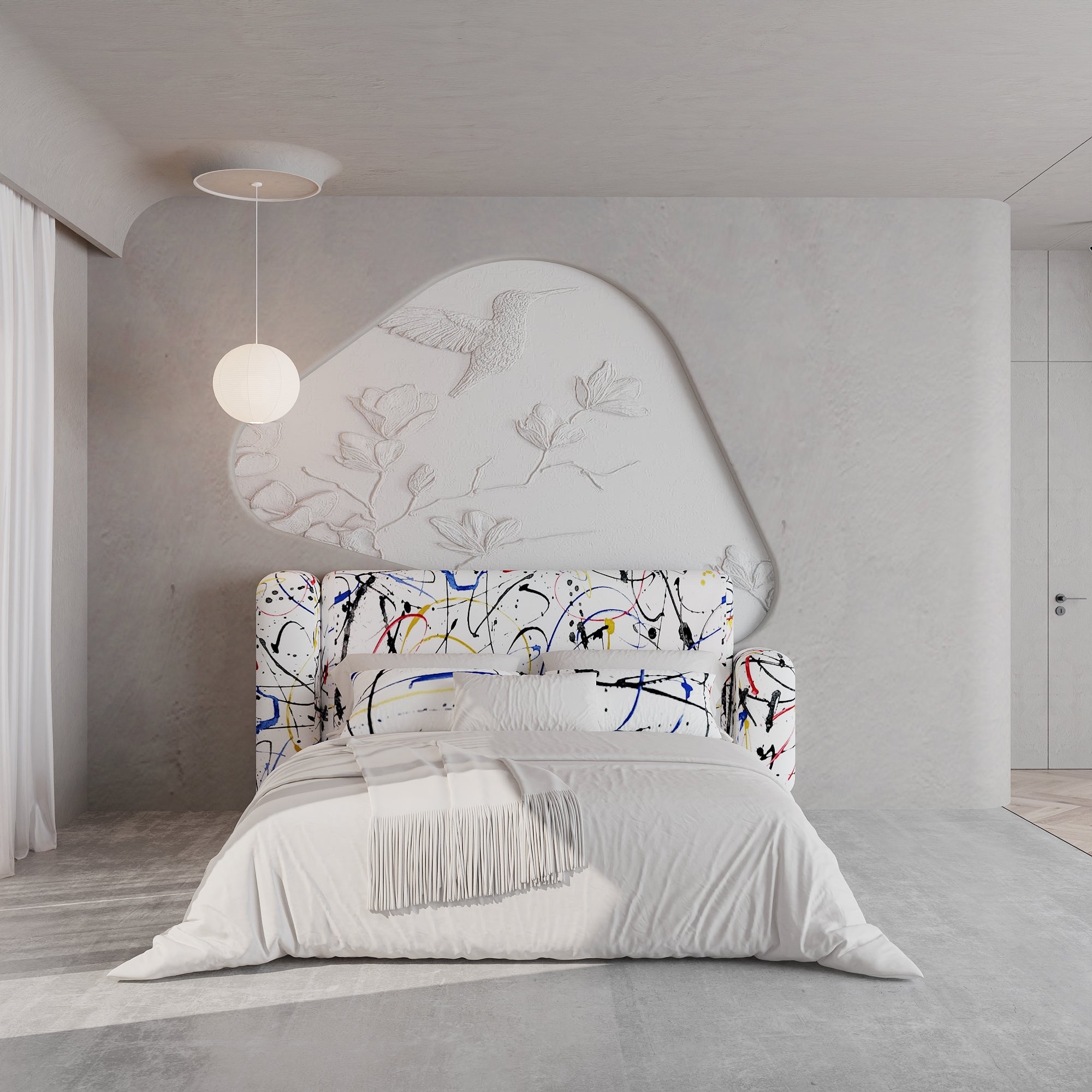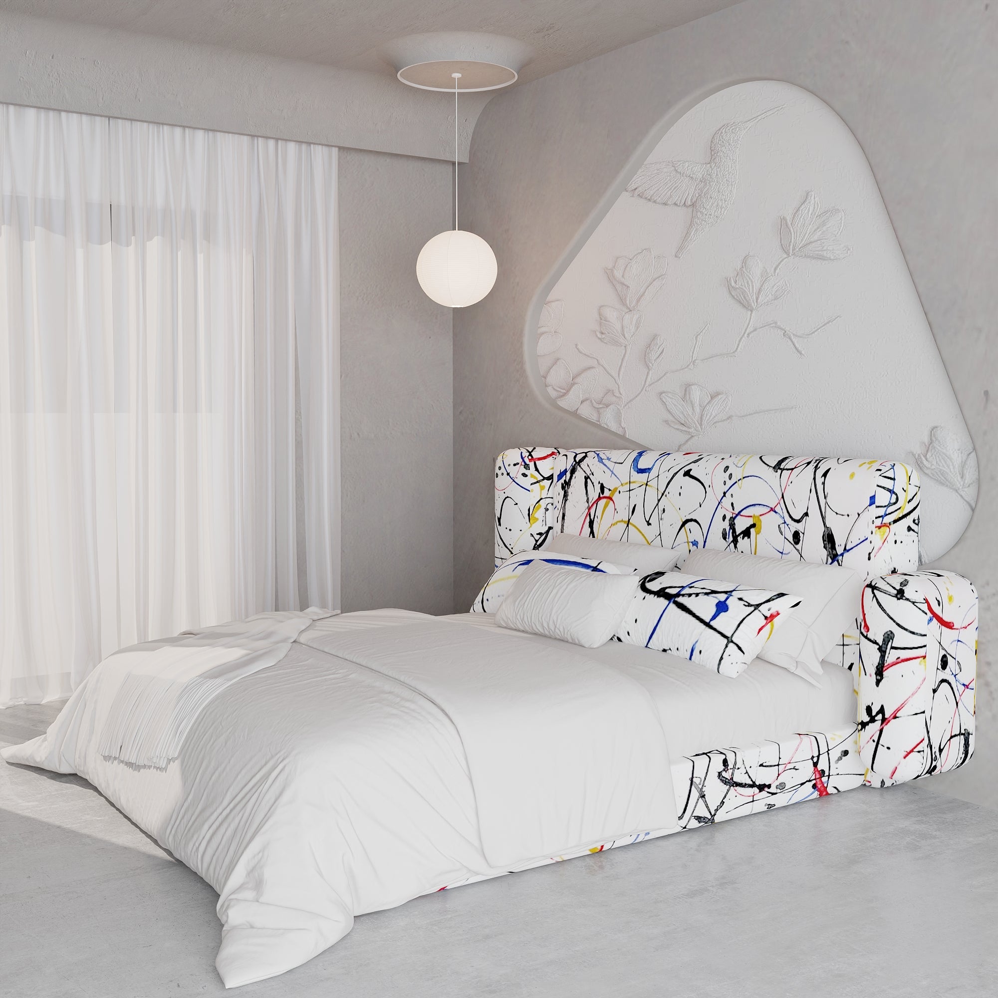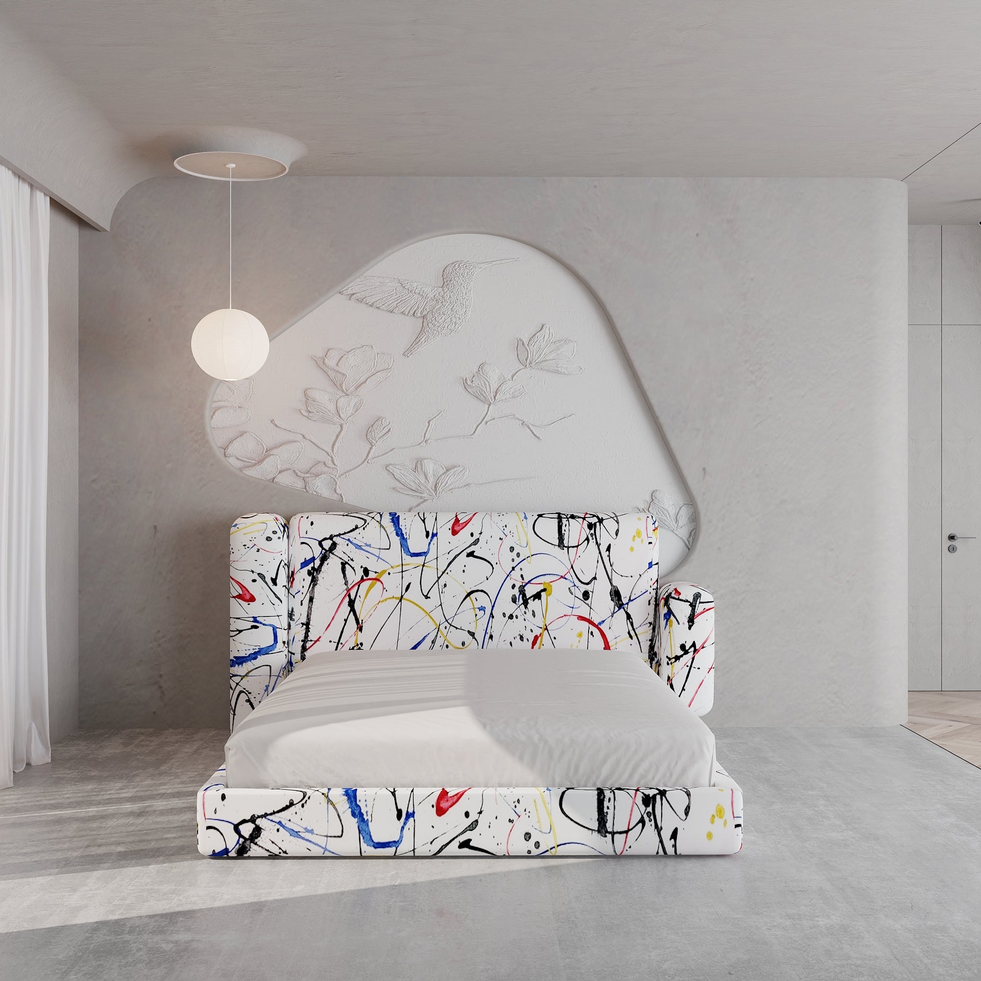 Introducing the Chroma Bed, a vibrant fusion of art and modern design. Upholstered in premium white velvet, this bed features an eye-catching abstract multicolored paint pattern, bringing a splash of creativity and energy to any bedroom. The Chroma Bed is a perfect blend of comfort and bold style, making it a standout centerpiece in contemporary decor.