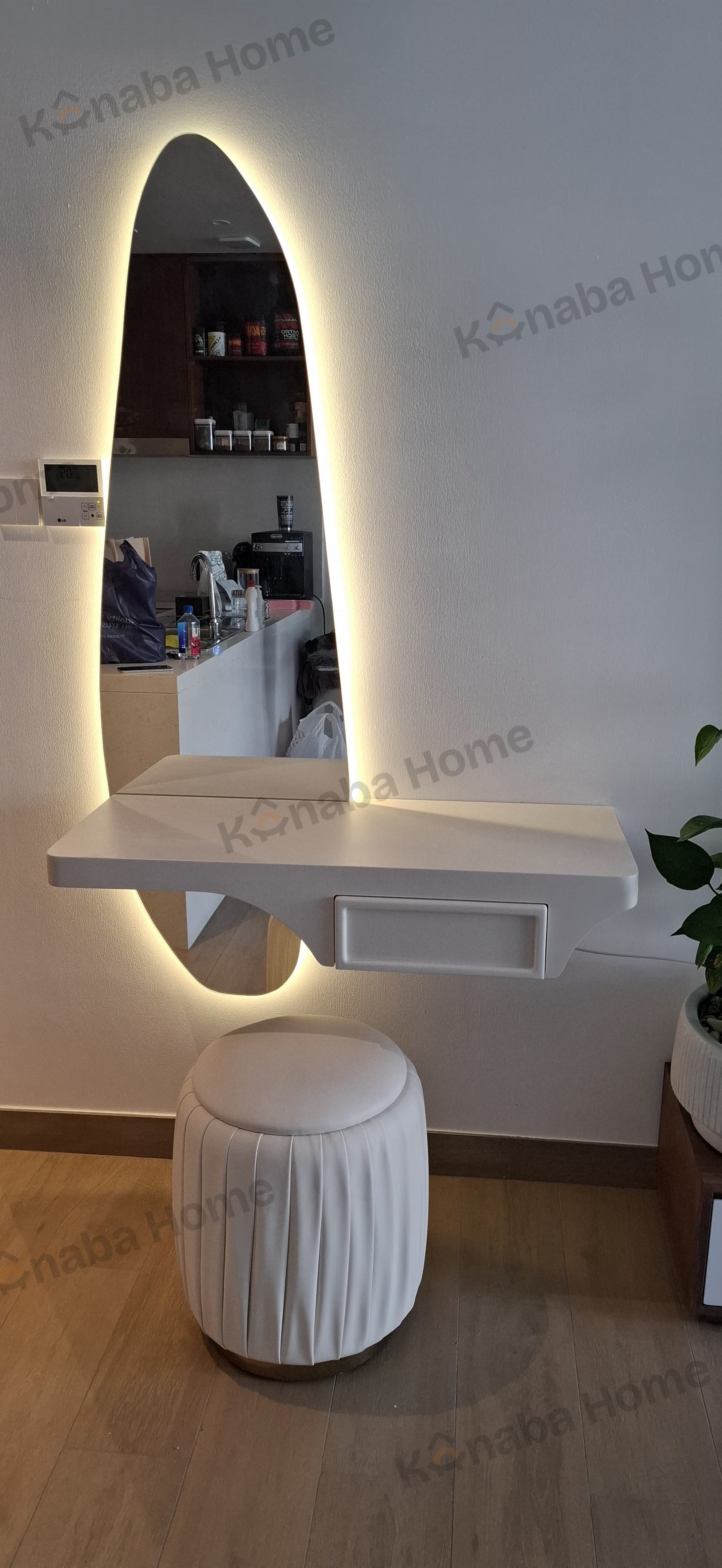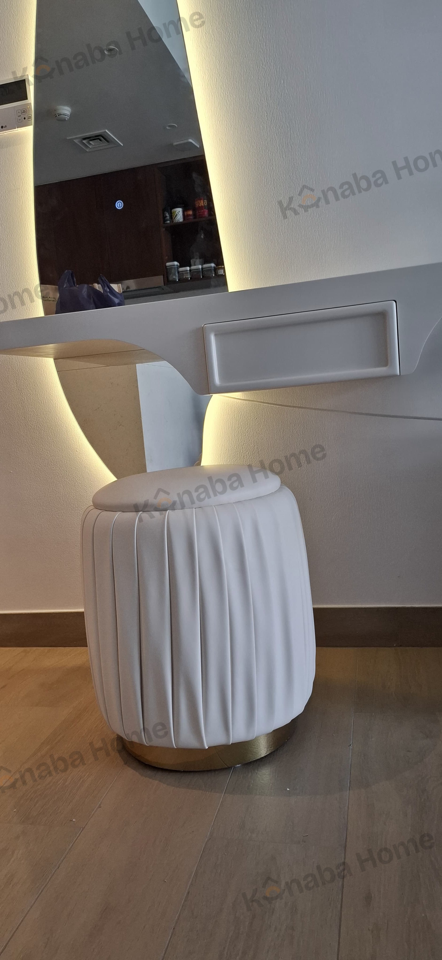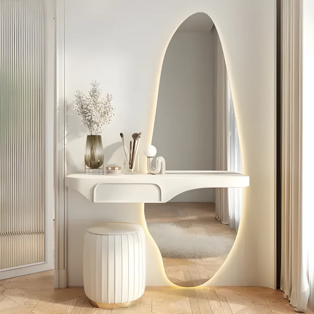 Introducing the Cloud Vanity - the perfect blend of modern design and space-saving functionality. Ideal for small spaces or those looking to maximize floor space, this vanity table is mounted to the wall, creating a minimalist and airy feel. The contemporary white finish, combined with clean lines, adds a touch of elegance to any room. Featuring a single drawer for storing makeup, hair accessories, or other beauty essentials, this vanity is as practical as it is stylish. The attached mirror, complete with LED cove lighting, can be tilted to adjust the angle, ensuring the perfect reflection every time. A matching stool with PVC leather upholstery is included, making this set both convenient and chic.