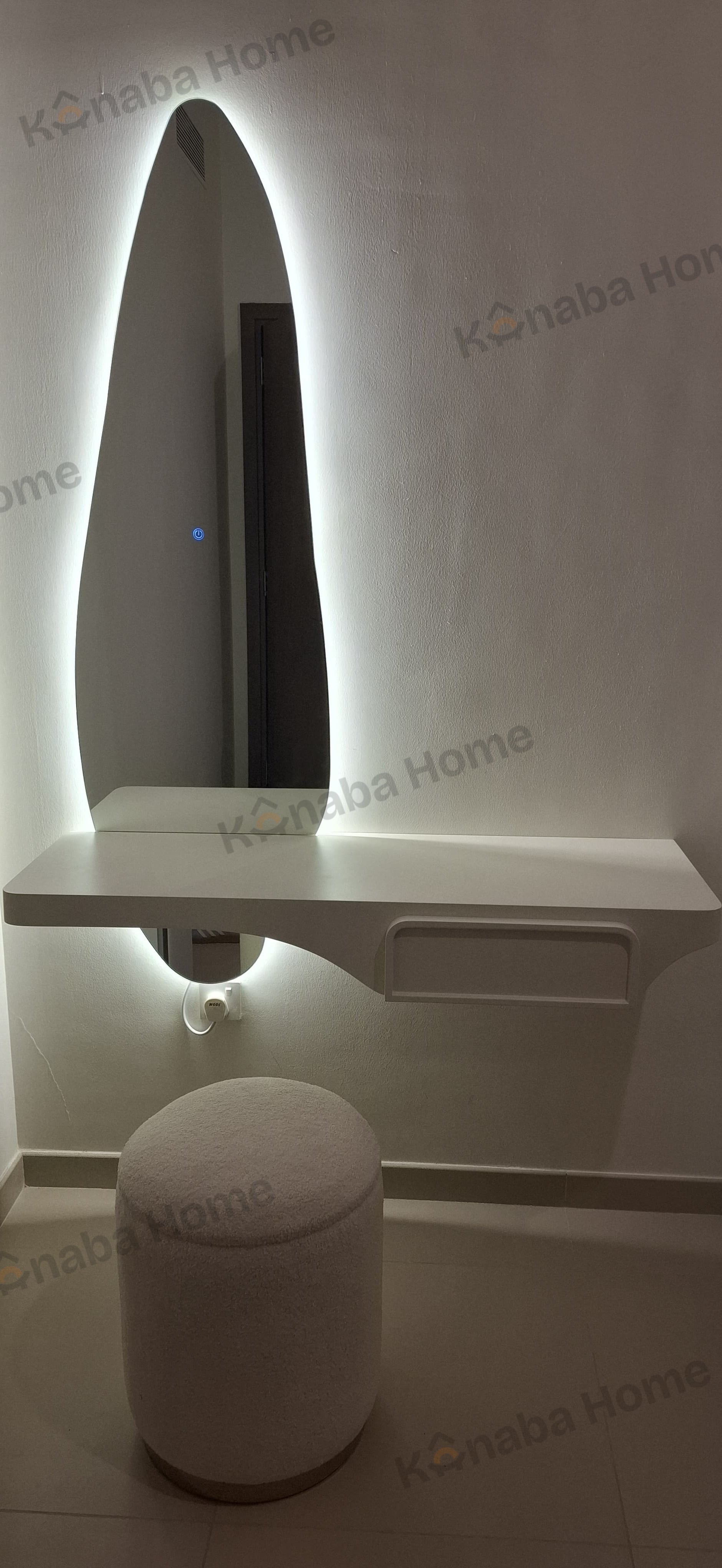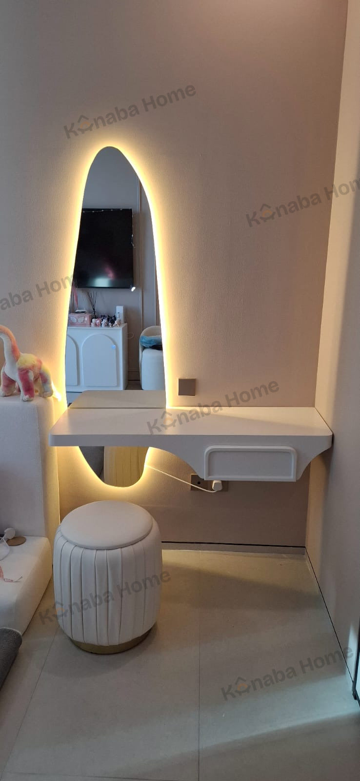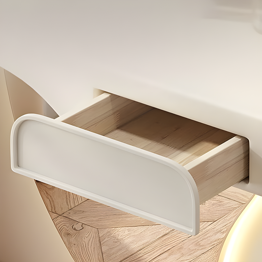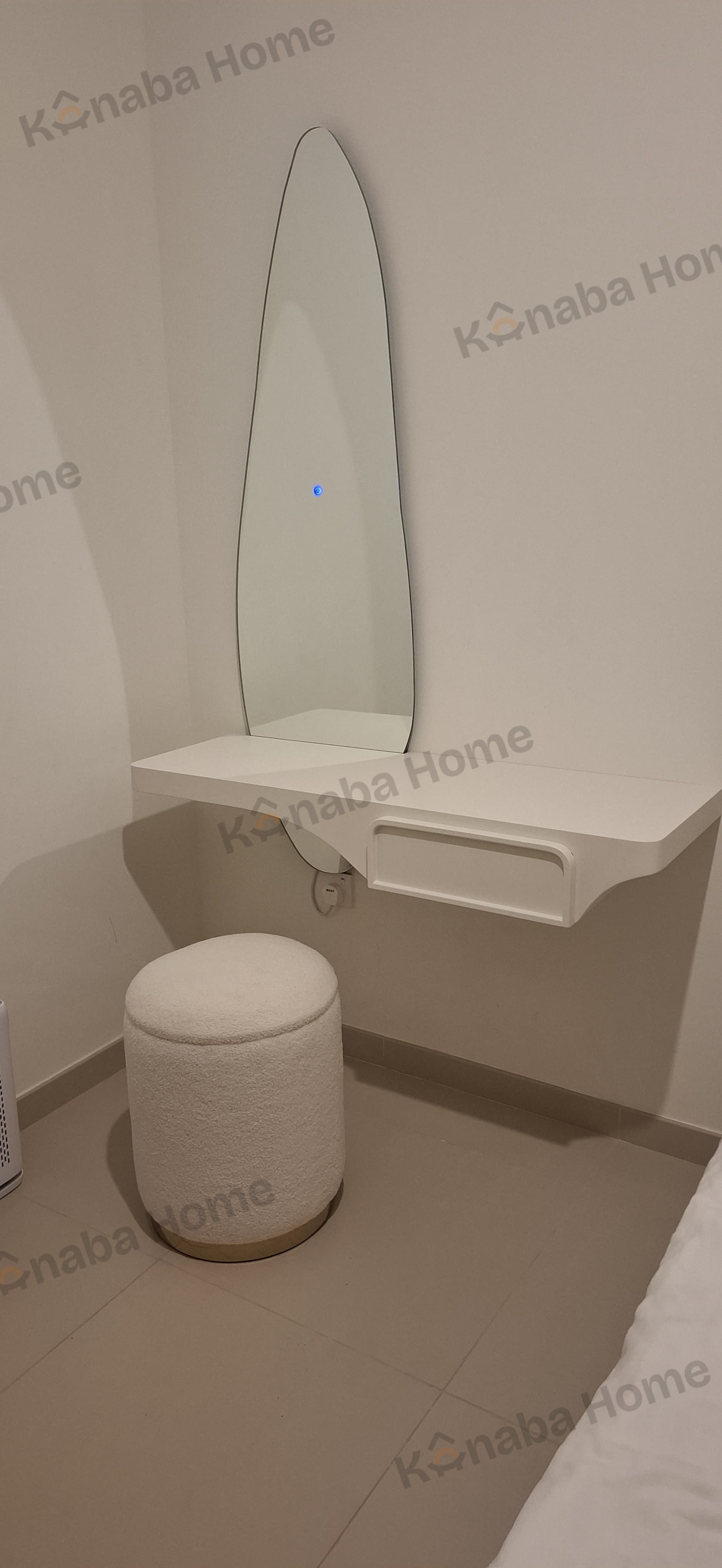 Introducing the Cloud Vanity - the perfect blend of modern design and space-saving functionality. Ideal for small spaces or those looking to maximize floor space, this vanity table is mounted to the wall, creating a minimalist and airy feel. The contemporary white finish, combined with clean lines, adds a touch of elegance to any room. Featuring a single drawer for storing makeup, hair accessories, or other beauty essentials, this vanity is as practical as it is stylish. The attached mirror, complete with LED cove lighting, can be tilted to adjust the angle, ensuring the perfect reflection every time. A matching stool with PVC leather upholstery is included, making this set both convenient and chic.