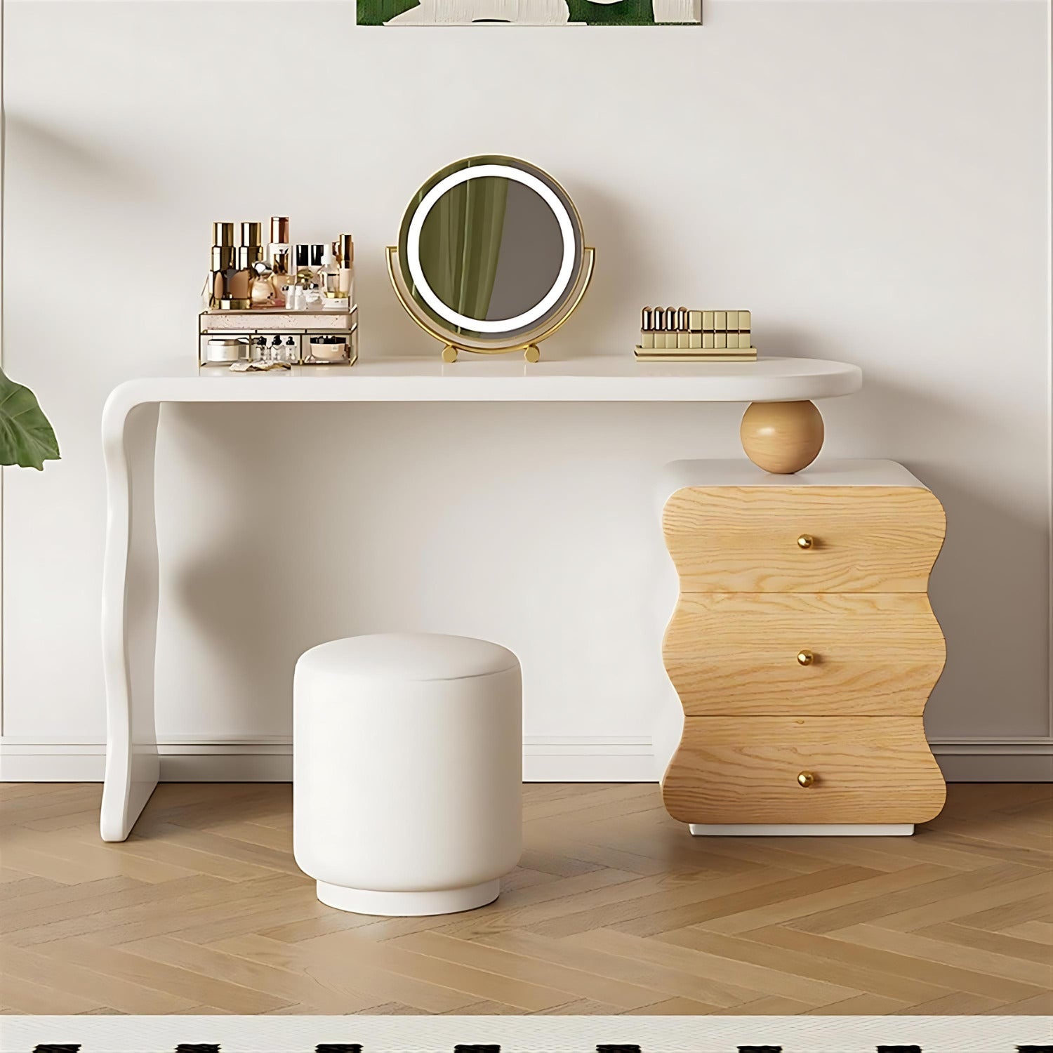 Introducing the Dolly Makeup Vanity - a modern masterpiece that combines style and functionality in one elegant package. With its sleek, wave-like white structure and natural wood finish on the three-drawer side cabinet, this vanity is designed to complement contemporary interiors. The spacious tabletop offers ample room for all your beauty essentials, ensuring that everything is within easy reach. The included round mirror adds a touch of elegance, while the plush cylindrical stool provides comfort and completes the set. Ideal for those who value both aesthetics and practicality, the Dolly Makeup Vanity offers plenty of storage space to keep your makeup, skincare products, and accessories neatly organized.