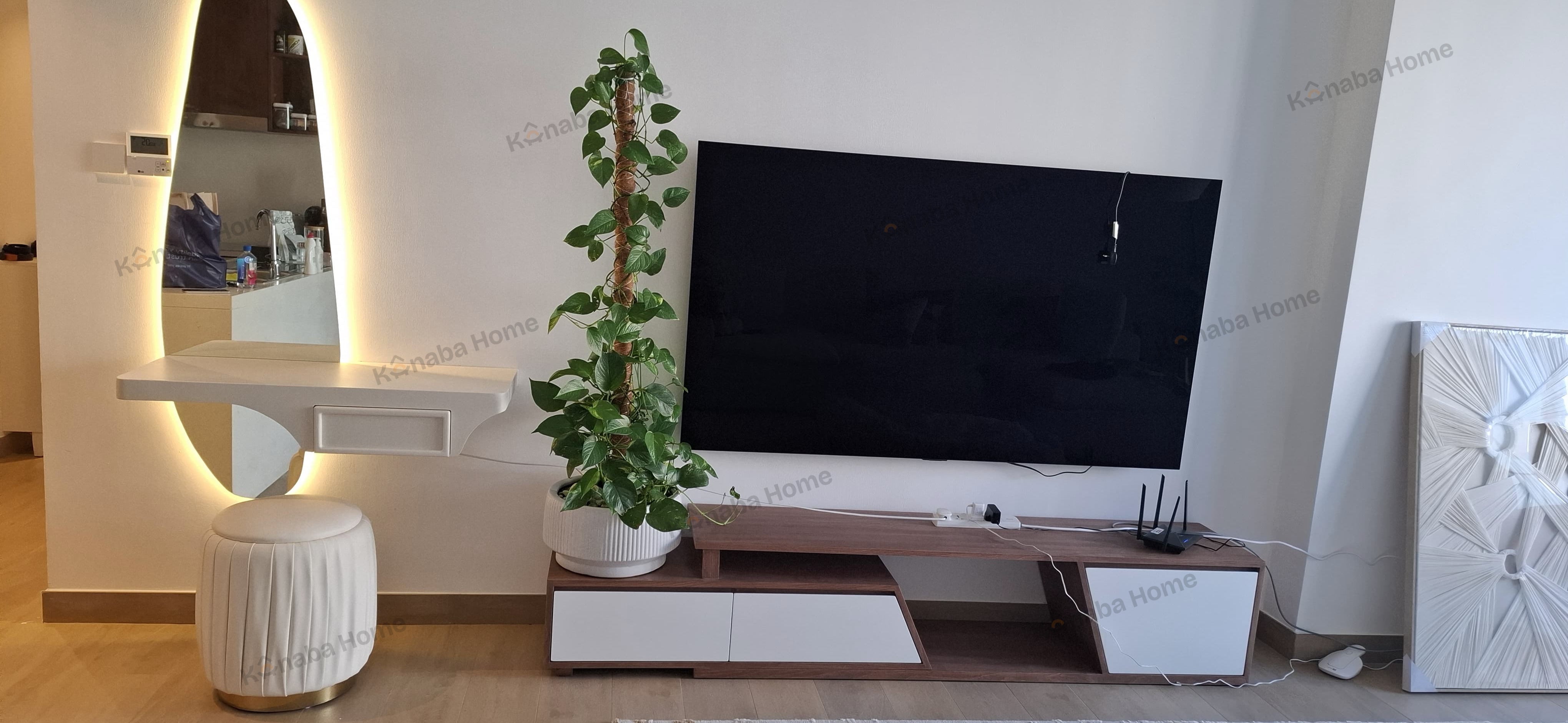 Transform your entertainment area with the sophisticated Eden TV Stand, a perfect blend of modern design and practicality. Its sleek, asymmetrical-inspired structure and expandable feature allow horizontal adjustments up to 275 cm, making it adaptable to various spaces. The combination of elegant white and warm walnut finishes enhances any contemporary living room. With spacious pull-out drawers and an open shelf, the Eden TV Stand provides ample storage while adding a touch of minimalist charm to your home.