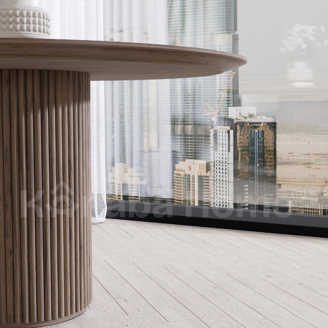 Compact, warm, and effortlessly stylish, the Edith Dining Set is designed to elevate dining spaces with a blend of minimalist form and classic function. Featuring a round dining table with a natural wood veneer top and pedestal base in a rich walnut finish, this set comfortably seats four, perfect for cozy kitchen corners or smaller apartment dining areas. Paired with four modern chairs that showcase a solid wood frame and plush linen upholstery, the Edith Dining Set offers a refined yet welcoming dining experience.