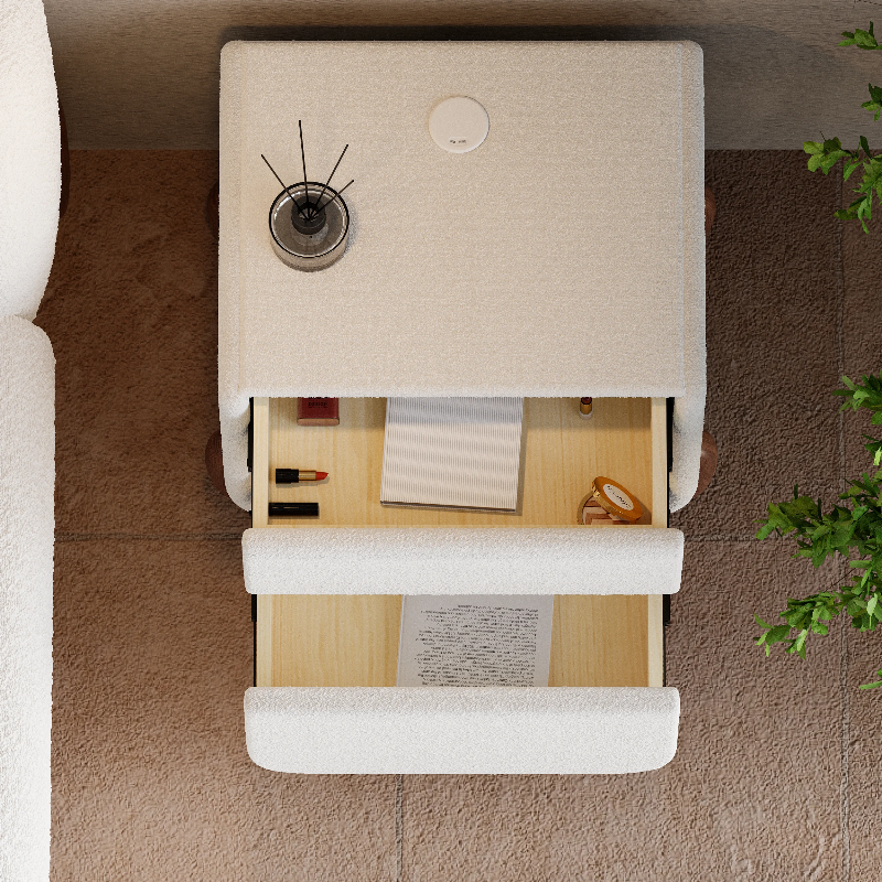 Transform your space with the Fay Nightstand, a perfect fusion of modern elegance and functional design. Upholstered in soft, no-shedding white boucle fabric, this nightstand brings a cozy, luxurious feel to any room. It features two spacious drawers for ample storage and a built-in charging station that offers both wireless and wired power options, keeping your devices charged and cords neatly concealed. Supported by sturdy natural ash wood legs, the Fay Nightstand is as stylish as it is practical, making it an ideal addition to your bedroom or living space.