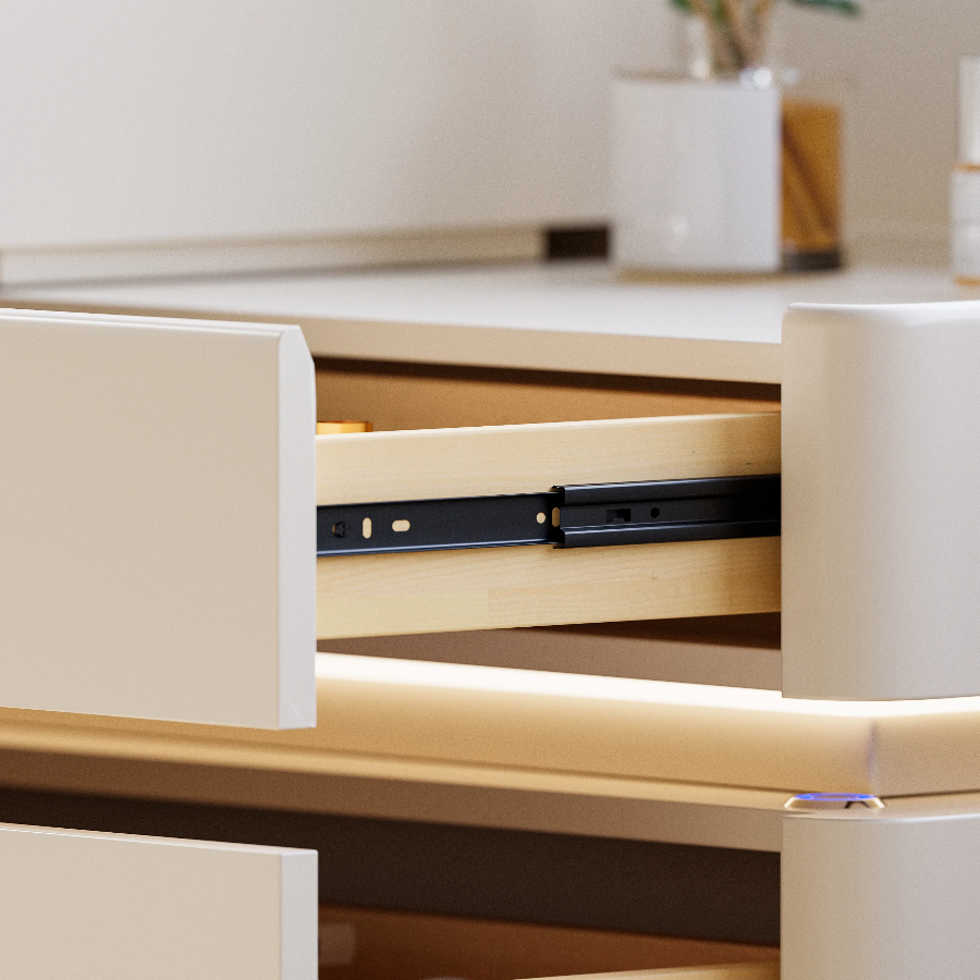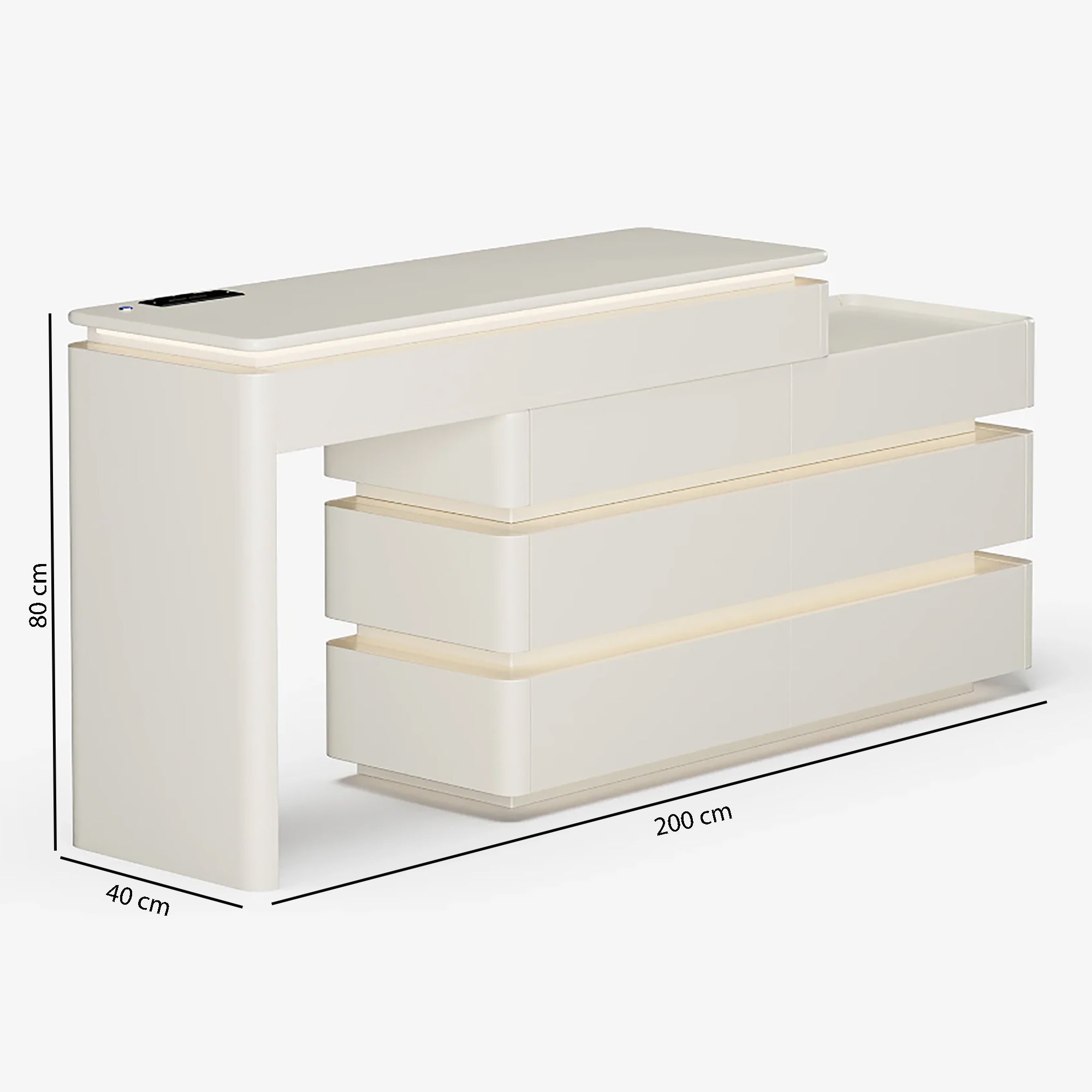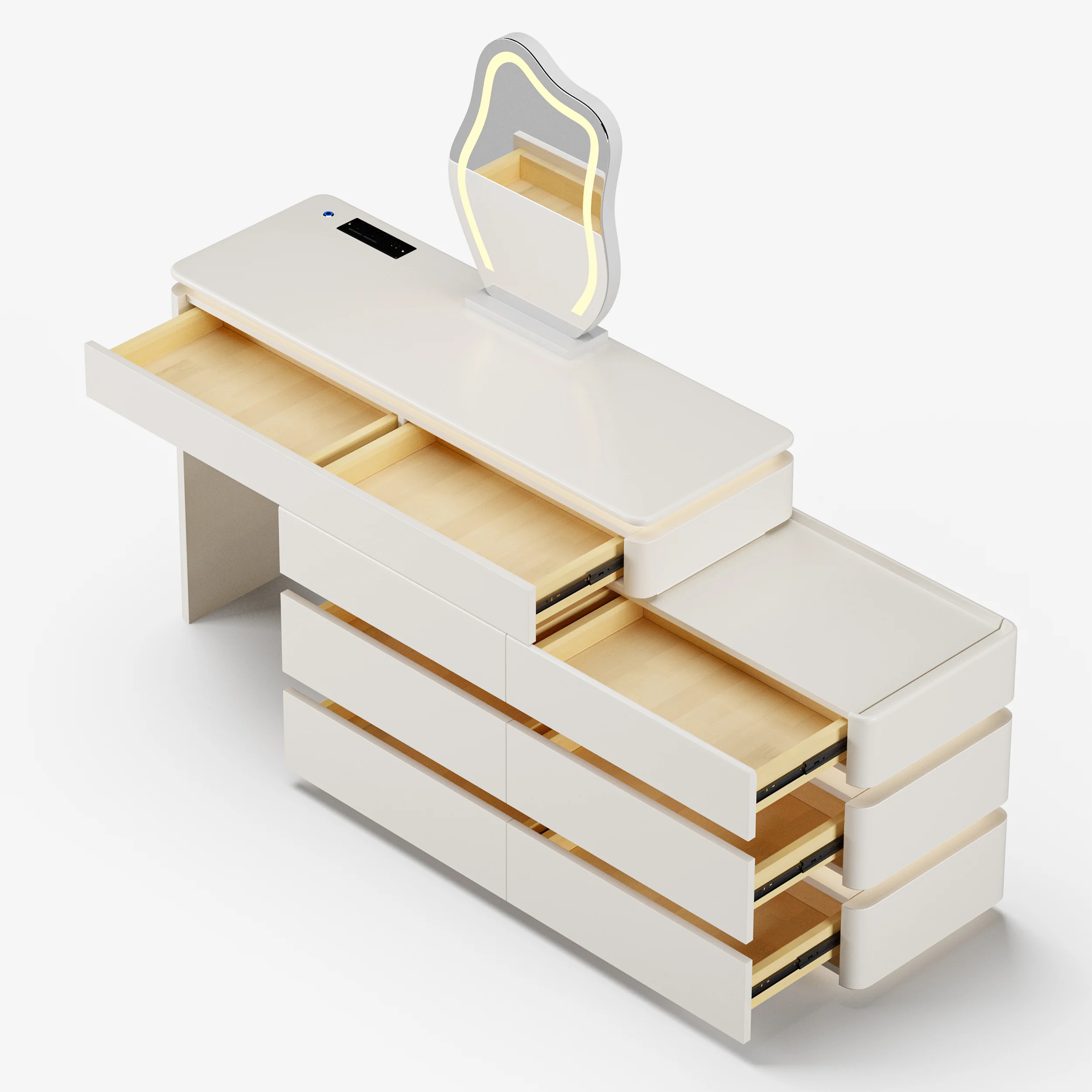 Redefine your beauty space with the Ilune Makeup Vanity, a modern and multifunctional piece crafted to adapt effortlessly to your needs. Its innovative retractable design allows it to transform from a compact straight layout to an expansive L-shape, making it perfect for maximizing space in any room. A sculptural standing mirror with soft, dimmable LED lighting ensures flawless visibility, while subtle LED strips along the drawers and base add a sophisticated glow. With an integrated charging station, the Ilune Vanity keeps your beauty essentials and devices powered and neatly organized, delivering style, convenience, and versatility in one stunning design.