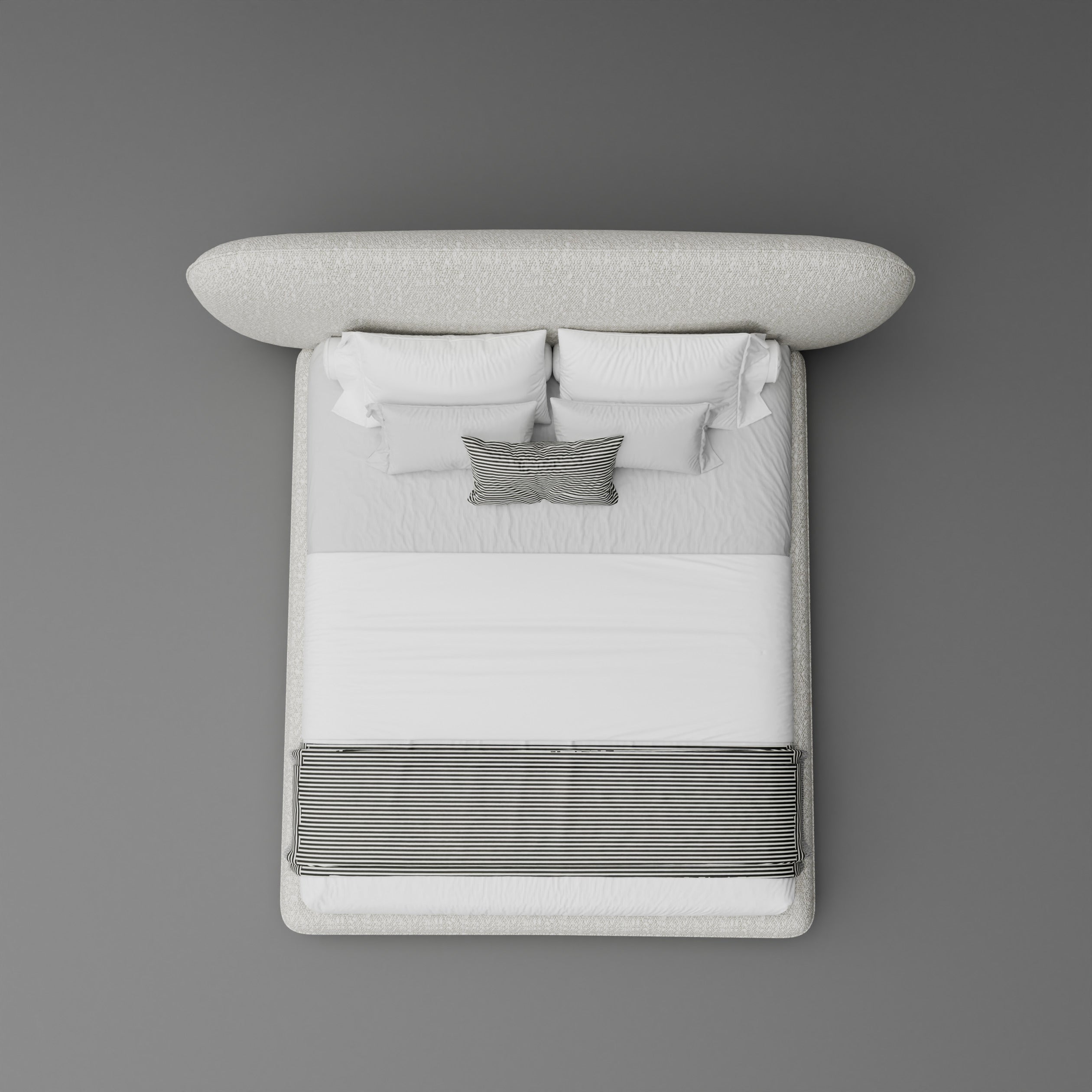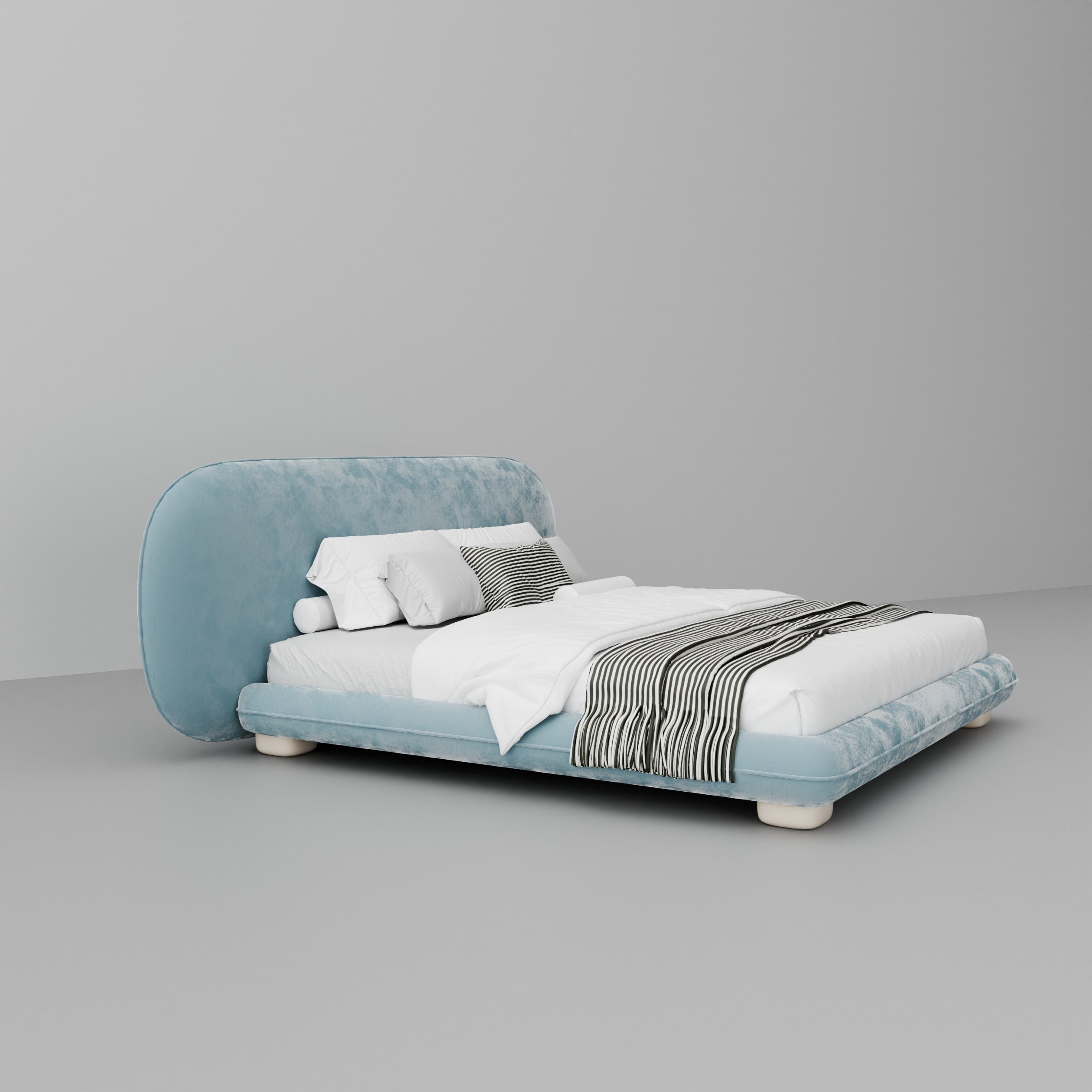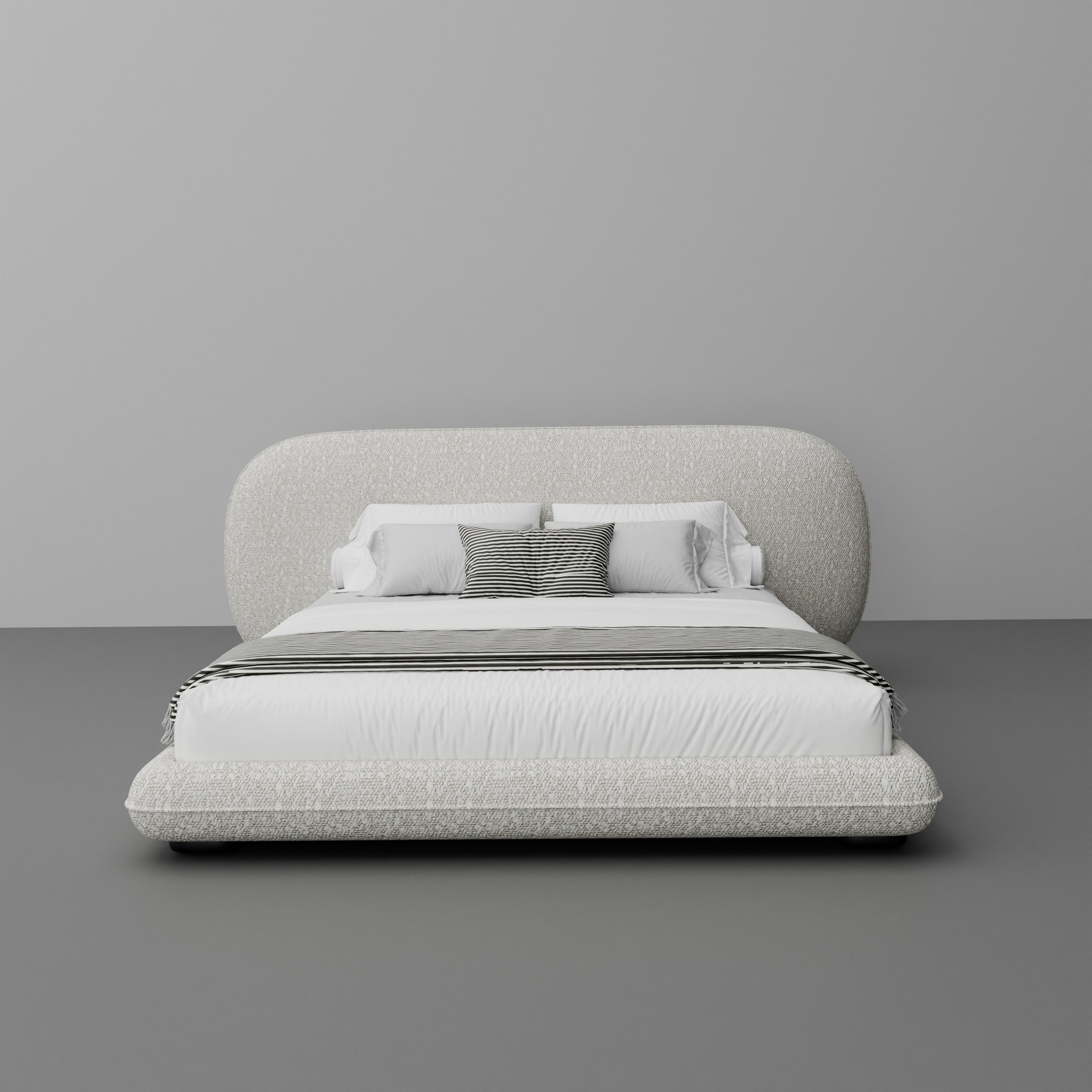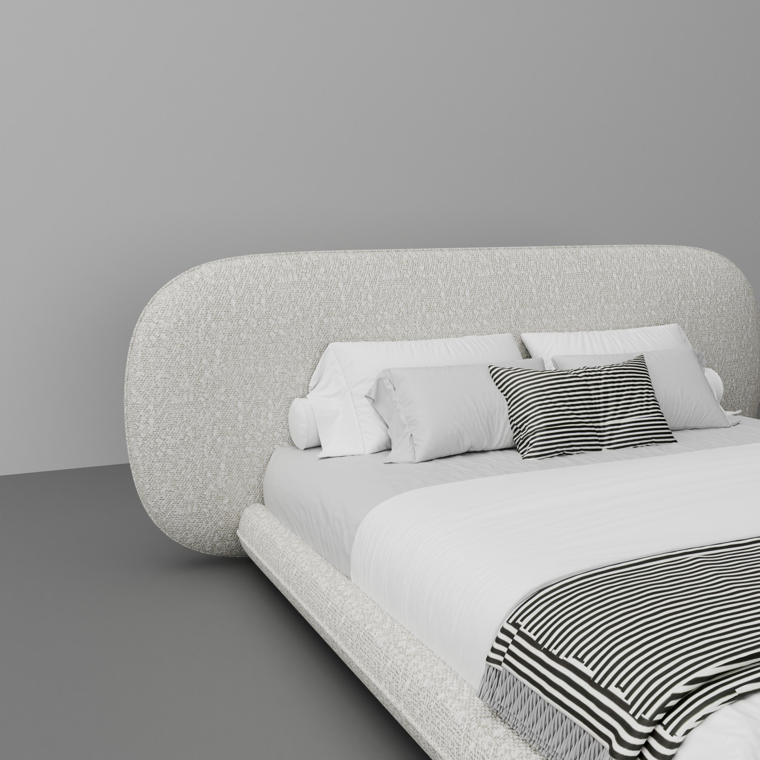 Indulge in the luxurious modern design of the Kandy Bed, upholstered in premium boucle for a stunning fusion of style and comfort. This elegant bed features a gracefully curved headboard seamlessly integrated with a sleek platform, making it a sophisticated centerpiece for any bedroom. Handcrafted with the finest materials, the Kandy Bed offers exceptional support and refined aesthetics for a truly luxurious sleep experience.