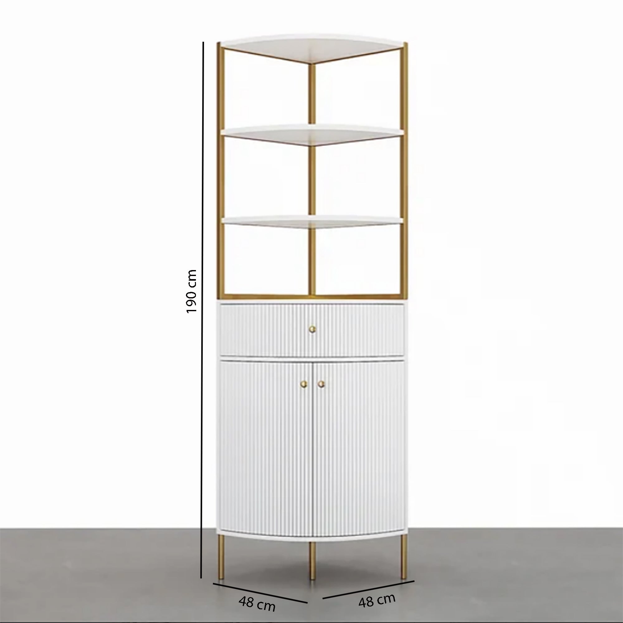 Introducing the Loree Bookshelf, an elegant solution for stylish storage and display in your home. With three spacious open shelves, this white bookcase is perfect for showcasing decorative items, collectibles, and cherished family photos. The addition of two doors and a drawer offers concealed storage, ideal for keeping items organized and out of sight. Crafted with classic molding and a refined gold metal finish, the Loree Bookshelf adds a timeless touch of sophistication to any living room, guest room, or office, seamlessly blending functionality with aesthetic appeal.