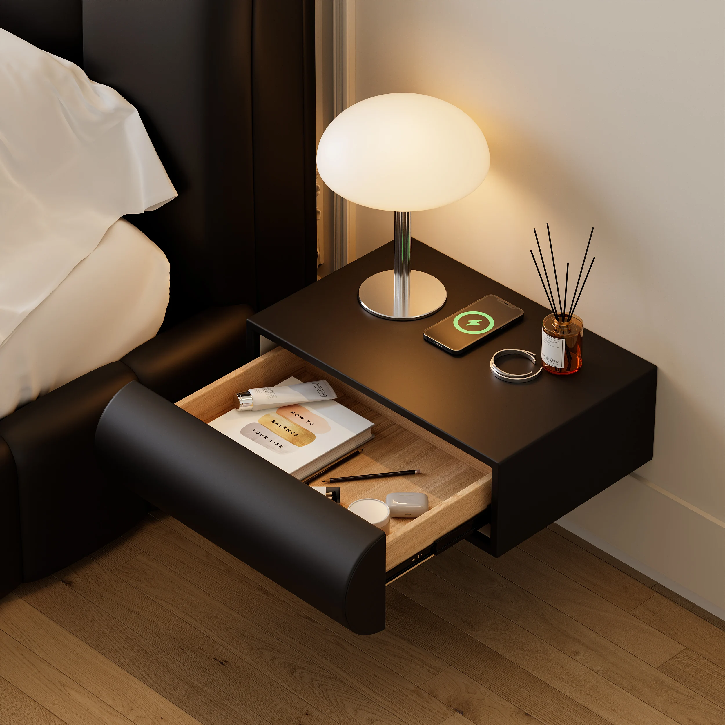 Streamline your bedroom with the Loria Wall-mounted Drawer Nightstand, a minimalist solution for modern living. This floating nightstand is thoughtfully designed to combine sleek aesthetics with everyday practicality. Its compact, wall-mounted design keeps your floor space open while offering essential storage within easy reach. Expertly crafted from a durable blend of solid wood and MDF, the Loria features a single, spacious drawer with smooth-glide metal runners for quiet, effortless access.