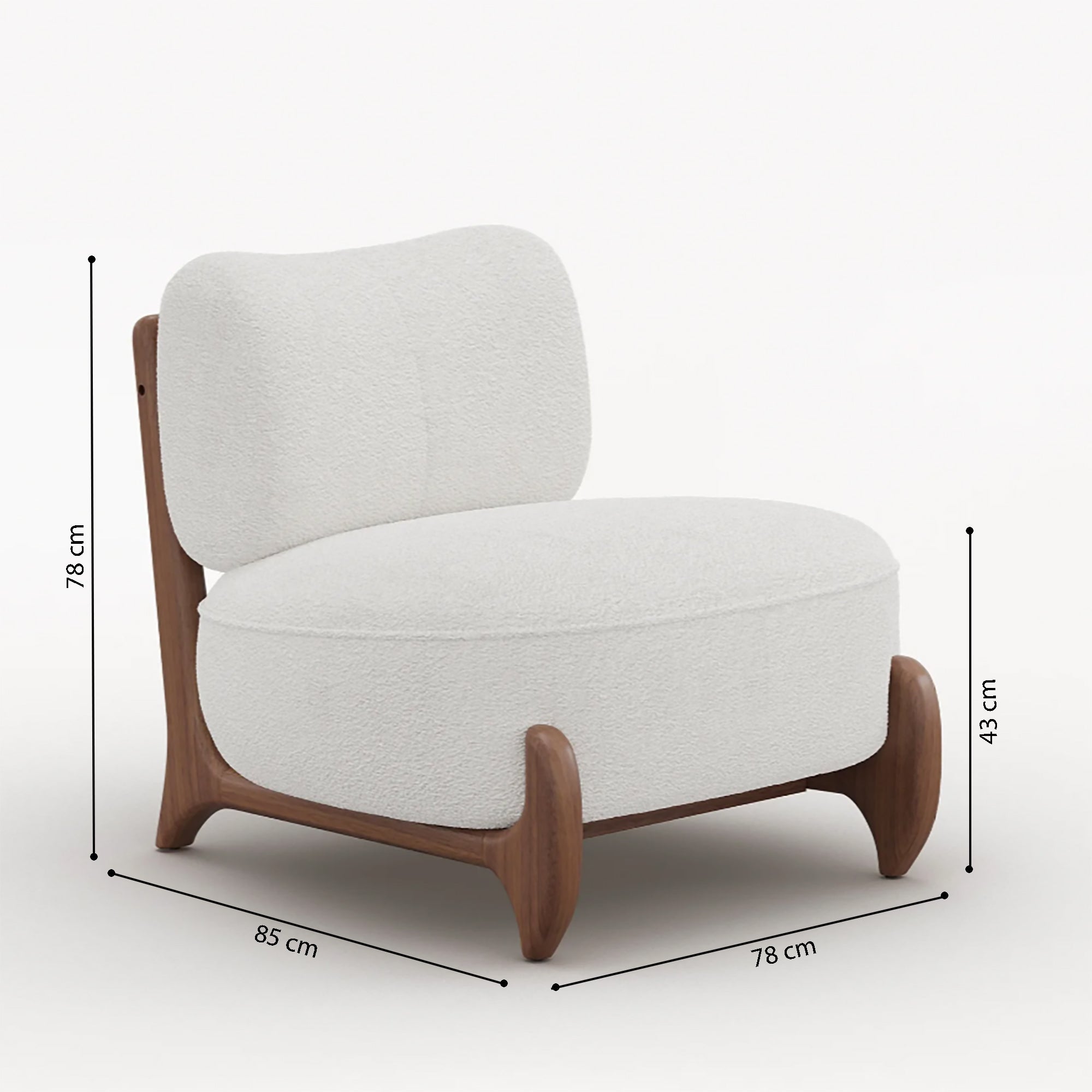 Sink into sculptural comfort with the Lyna Accent Chair, where timeless mid-century inspiration meets soft, contemporary elegance. Upholstered in plush white boucle fabric, the Lyna Accent Chair brings tactile warmth and modern style to any space. Its gently contoured, armless silhouette invites relaxed lounging, while the beach solid wood frame, finished in a rich walnut tone, offers durability with artistic flair.