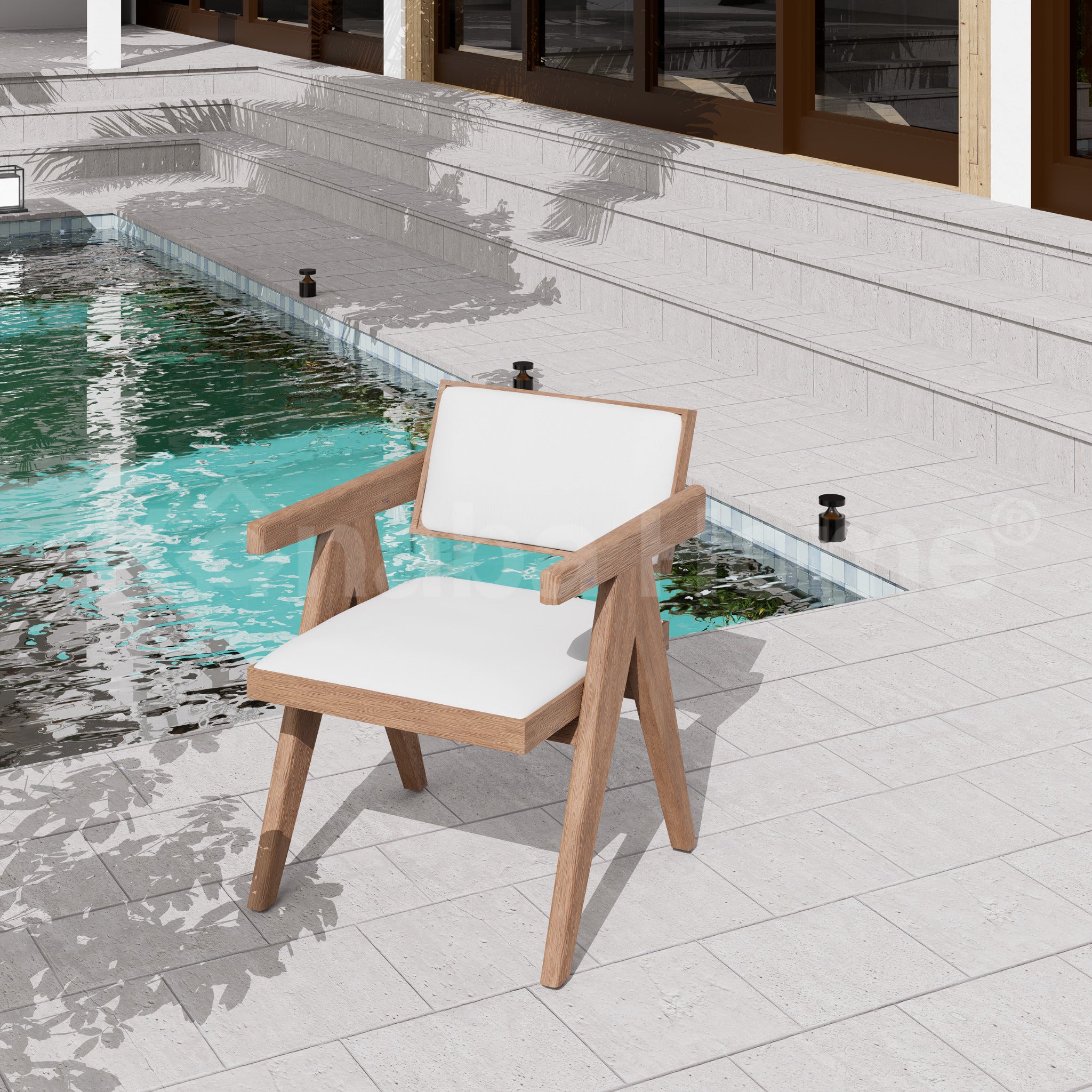 Designed for long-lasting comfort, the chair features ergonomically angled arms and backrests, paired with plush cushions upholstered in premium, weather-resistant white outdoor fabric. The clean lines and sculptural wooden frame create an inviting yet modern aesthetic, ideal for patios, terraces, and garden dining spaces.