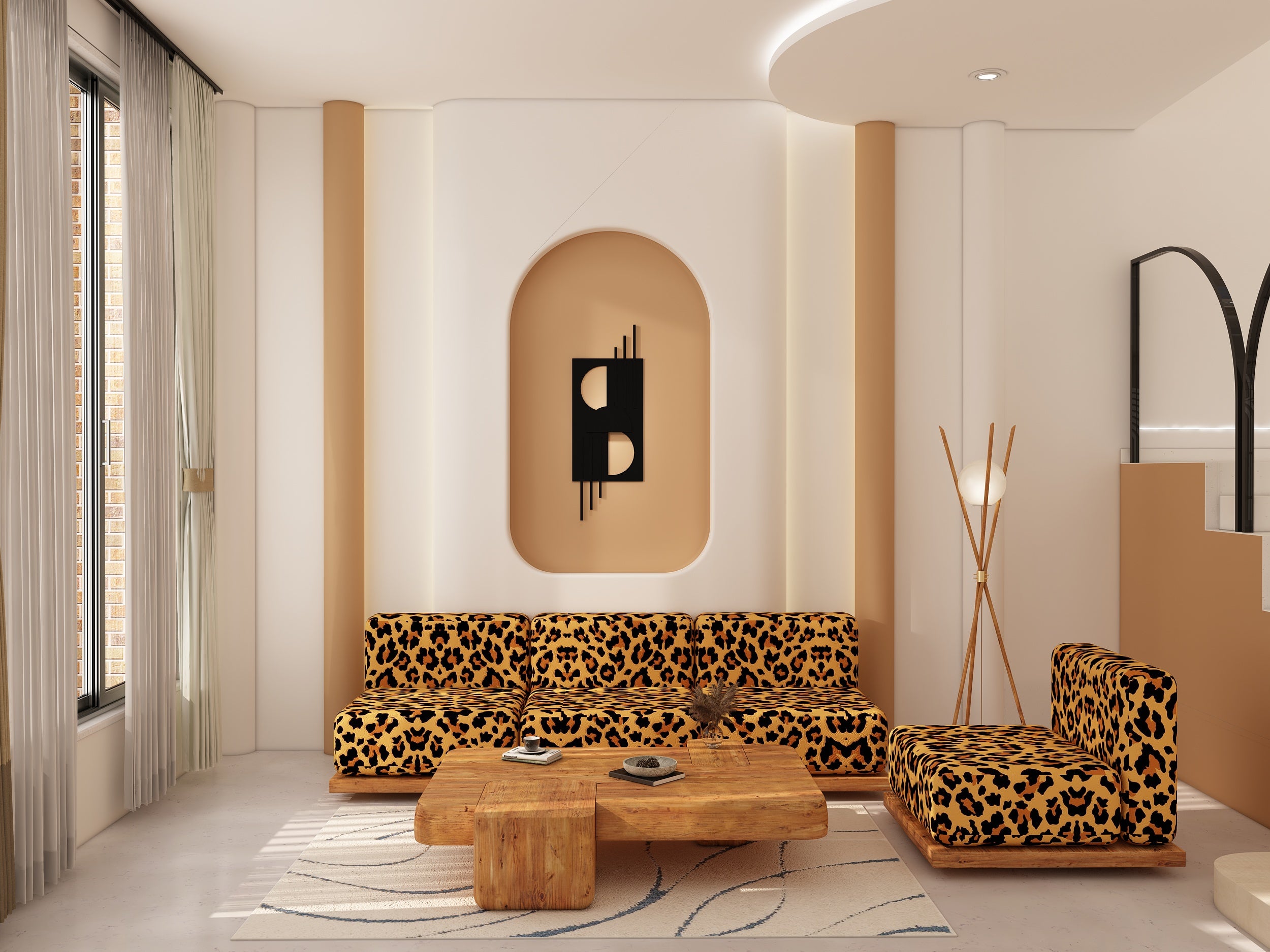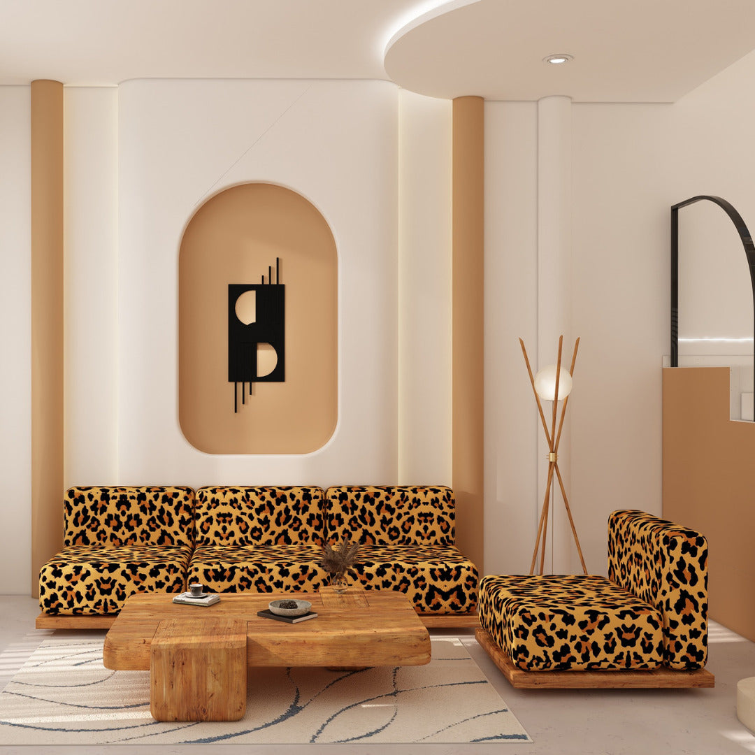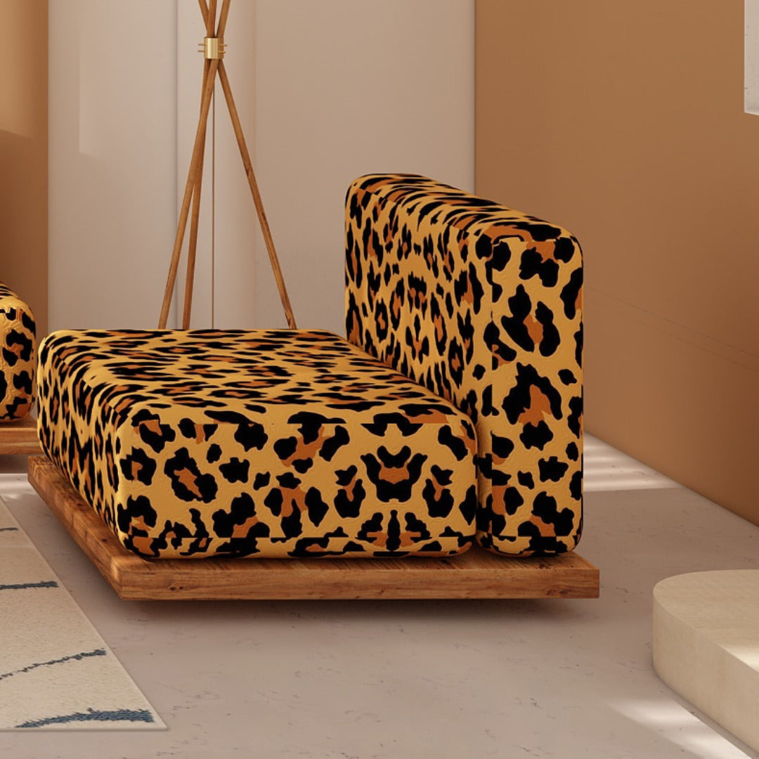 Introducing the Olos Japanese Set, a captivating blend of exotic style and luxurious comfort. This striking set includes a three-seater sofa, a single chair, and a matching coffee table, each upholstered in bold leopard-print velvet for an unforgettable look. The plush, cushioned seating rests on a solid wooden base, seamlessly merging natural textures with eye-catching patterns. Perfect for contemporary and eclectic spaces, the Olos Japanese Set brings a sophisticated, wild flair to any room, serving as both a functional and statement-making centerpiece.