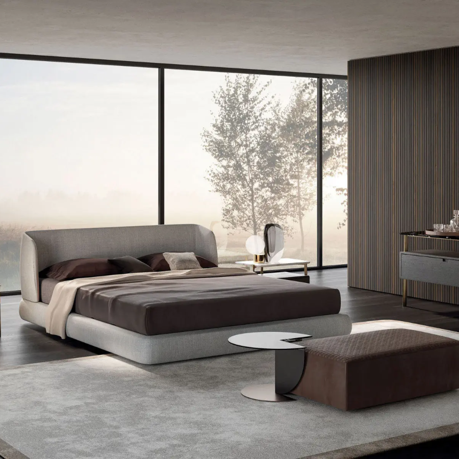 Elevate your bedroom with the sophisticated elegance of the Ostrow Bed, a masterpiece of sculptural design that effortlessly blends comfort and practicality. Its essential, inviting form is complemented by architectural outlines that add a graphic touch to its cushioned dimensions. The customizable headboard, available in fabric or leather, ensures that this bed can be tailored to suit your unique style.