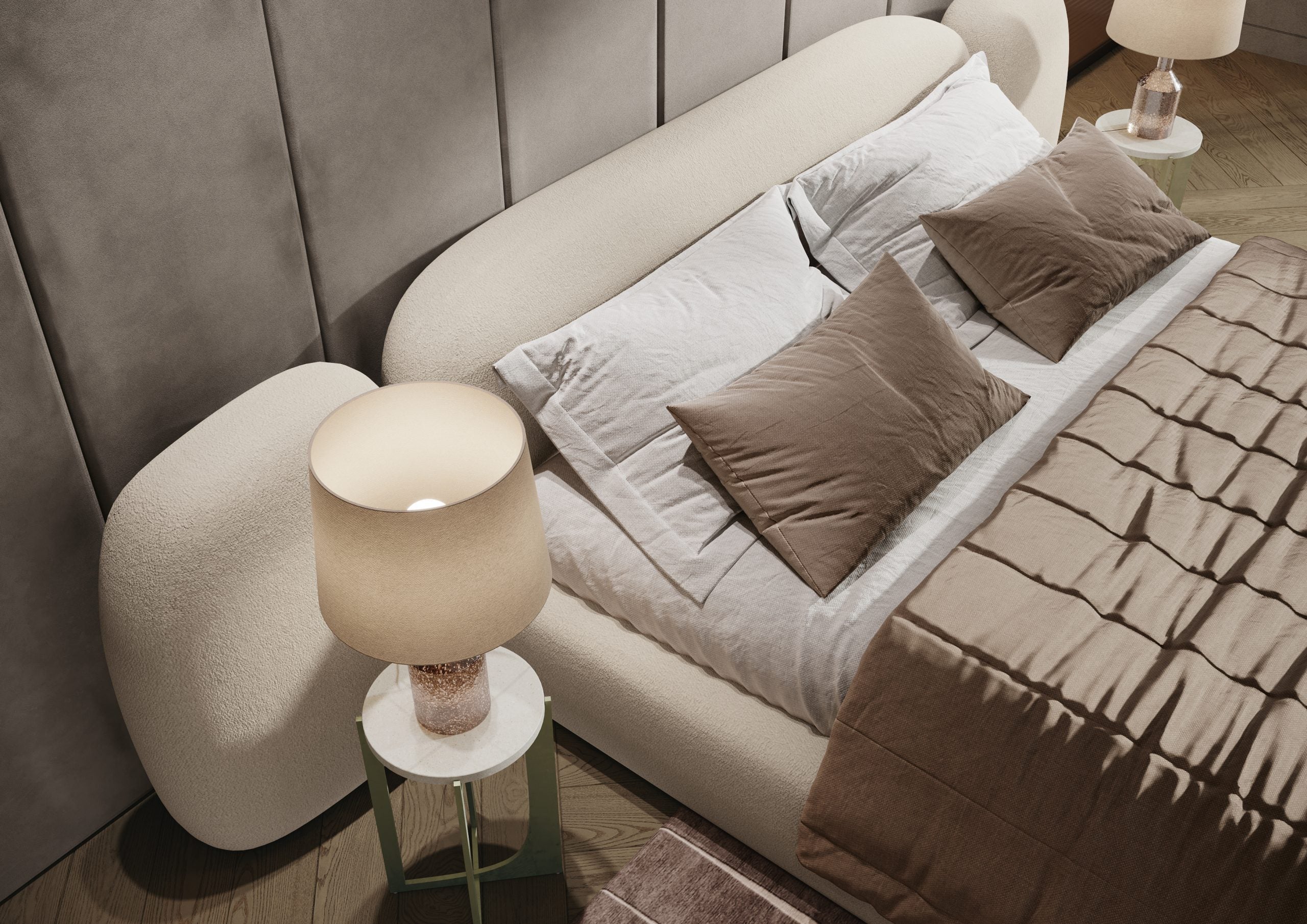 Discover the Roxie Bed, a masterpiece of sustainable design and luxurious comfort. Crafted with eco-sustainable solid ash, this bed offers both durability and environmental consciousness. The headboard and bed frame are upholstered in organic rubber and natural wadding, wrapped in elegant linen-colored boucle wool or velvet, adding a sophisticated touch to your bedroom. The bed also features two movable side panels that enclose the bedside tables, providing versatility and style.