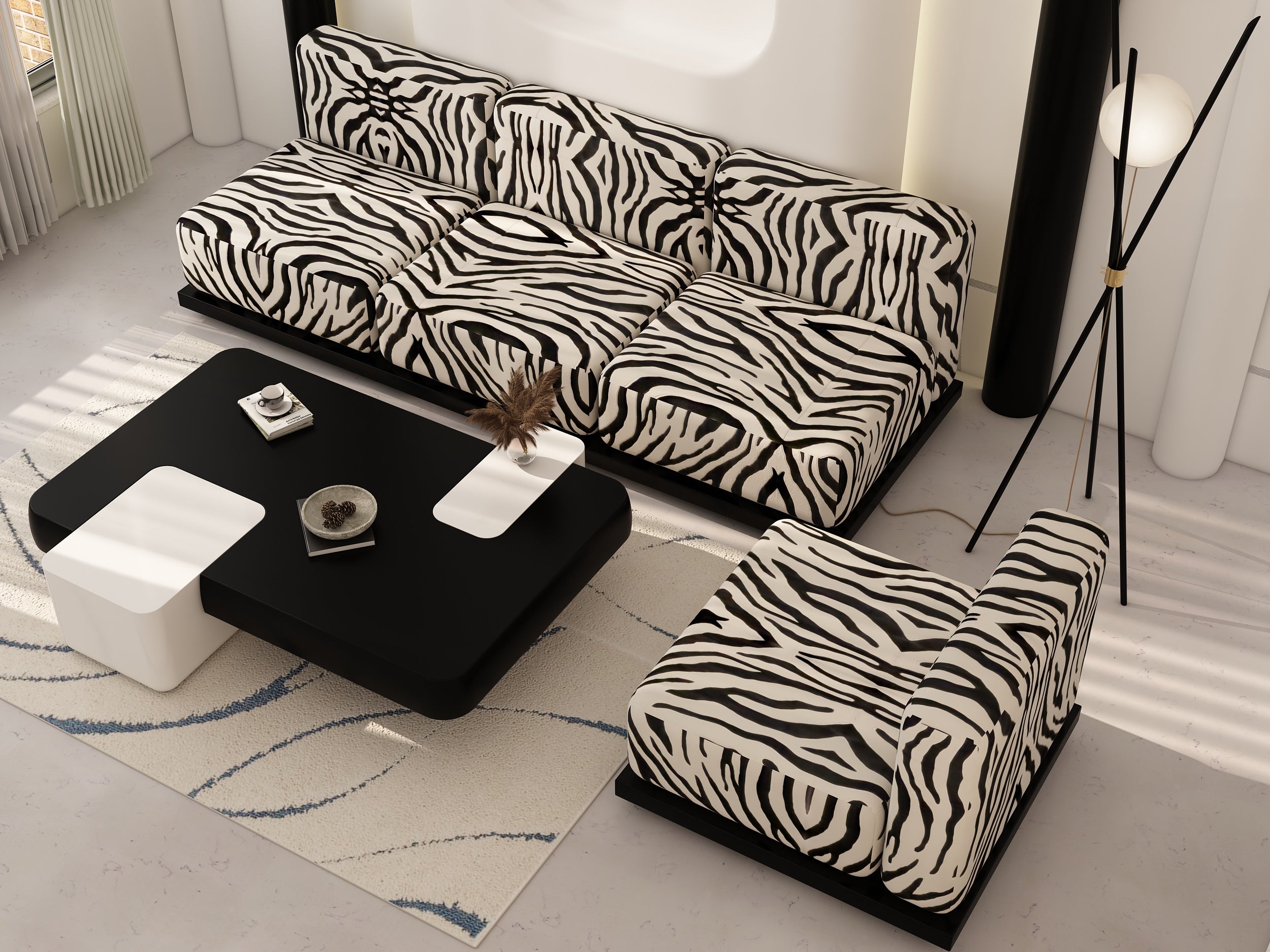 Introducing the Sereno 3S Sofa, an elegant and modern sofa designed to bring a timeless appeal to your living space. Upholstered in luxurious white and black zebra design velvet, the Sereno 3S Sofa features an armless silhouette that emphasizes its sleek, contemporary aesthetic. The black wood base provides a touch of sophistication and ensures stable support, making this sofa both stylish and functional. Transform your room with the refined charm of the Sereno 3S Sofa.