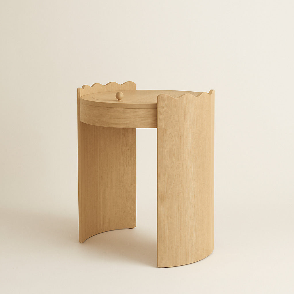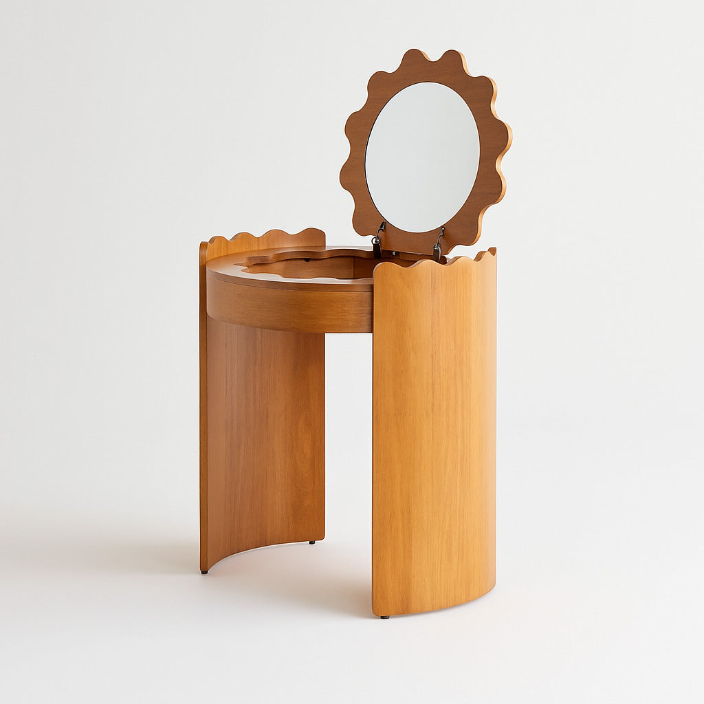 Bring elegance and practicality to your daily routine with the Tiana Makeup Vanity, a stunning addition to any getting-ready space. Featuring a round tabletop with a built-in storage compartment, this vanity keeps your beauty essentials organized and within reach. The flip-top mirror, framed in a playful squiggle, flower-inspired design, offers the perfect angle while you prepare for the day. Crafted with natural wood variance, each Tiana Makeup Vanity is truly unique, combining charm, function, and timeless style in one exclusive piece.