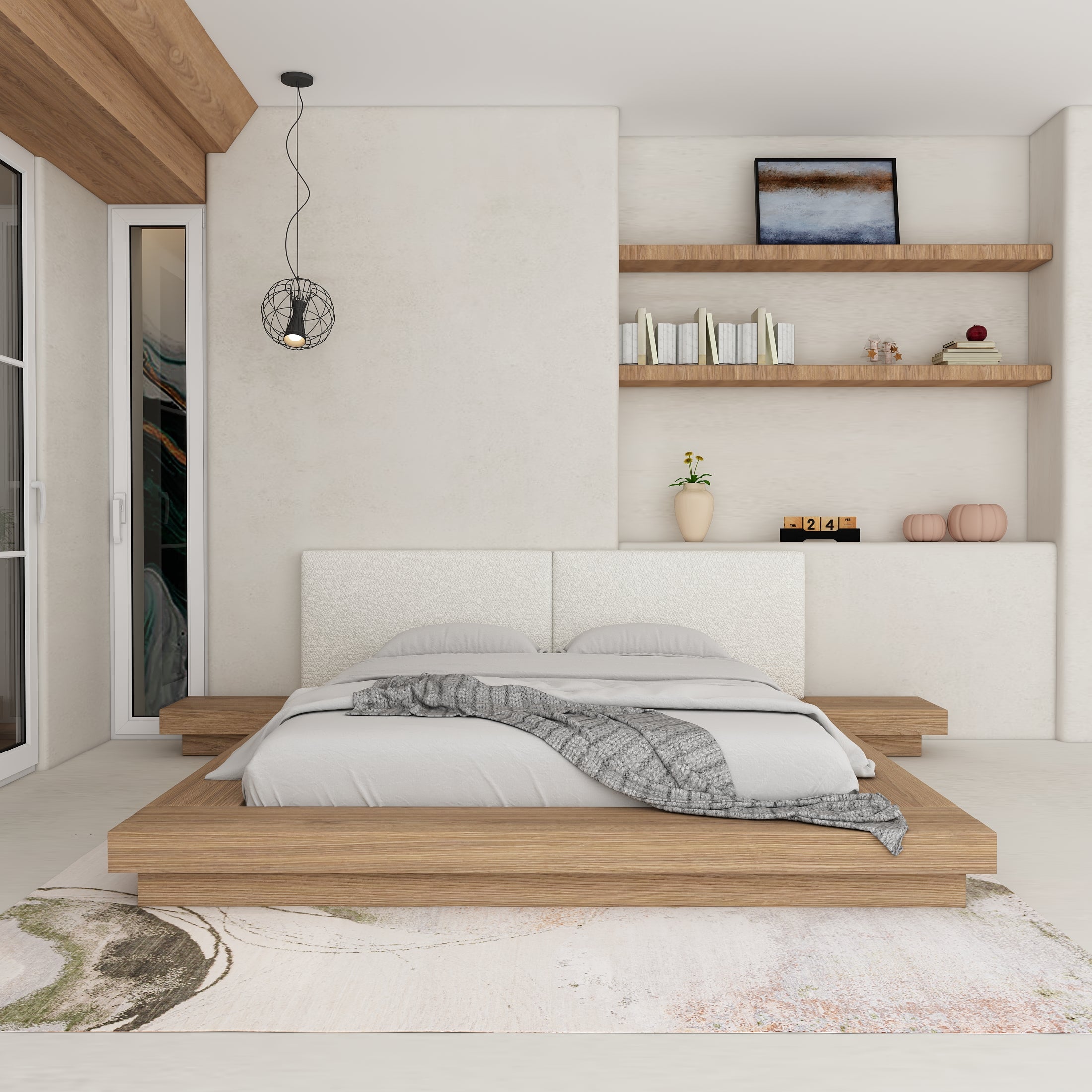 - Japanese-inspired platform bed with attached nightstands, providing a complete and cohesive look.