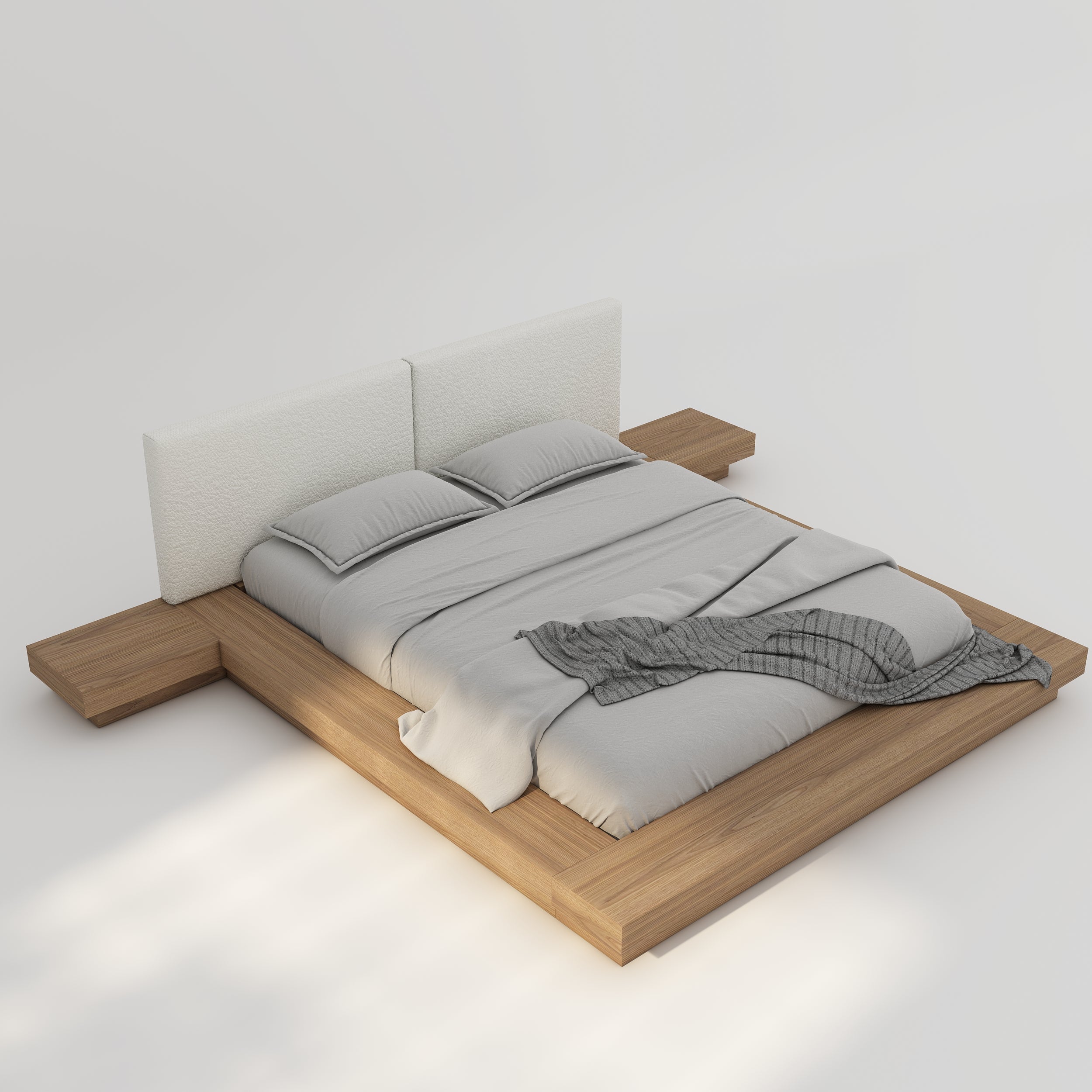 Introducing the Vivien Japanese Bed, a Japanese-inspired platform bed that effortlessly combines minimalist design with modern luxury. Featuring attached nightstands, this bed eliminates the need for a matching set, offering a cohesive and elegant solution for your bedroom. Designed with meticulous attention to detail, the nightstands extend gracefully from either side of the frame, seamlessly integrating into the overall design. The headboard, upholstered in your choice of boucle or linen fabric, is padded with foam for added comfort. The split headboard with a central line creates striking symmetry, while the concealed wooden base gives the bed a sophisticated floating effect.