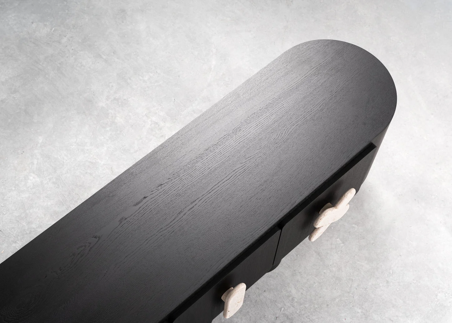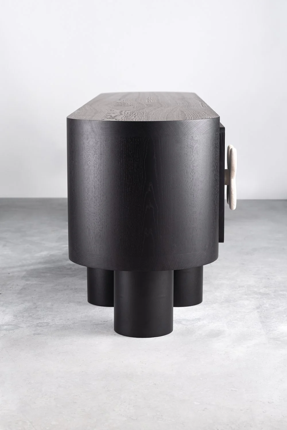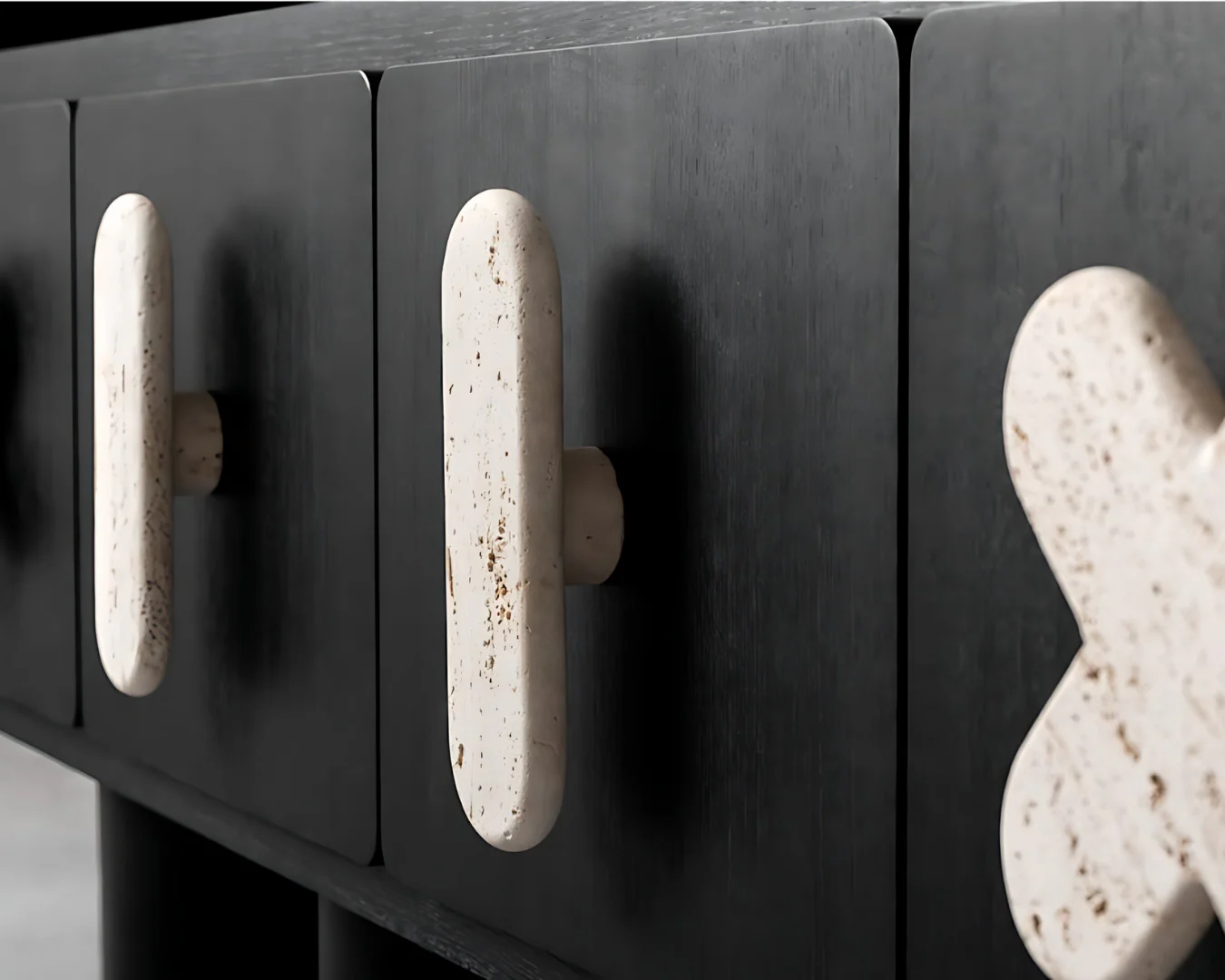 Introducing the X ELEVEN-XII TV Unit, a striking piece inspired by the elongated, rounded form of a myriapod. Designed for stability and crafted with precision, this unit combines solid wood with the elegant touch of travertine/ marble wood veneer handles. Its balanced symmetry and robust materials bring both strength and refined elegance to any living space, making it a perfect focal point for modern interiors.
